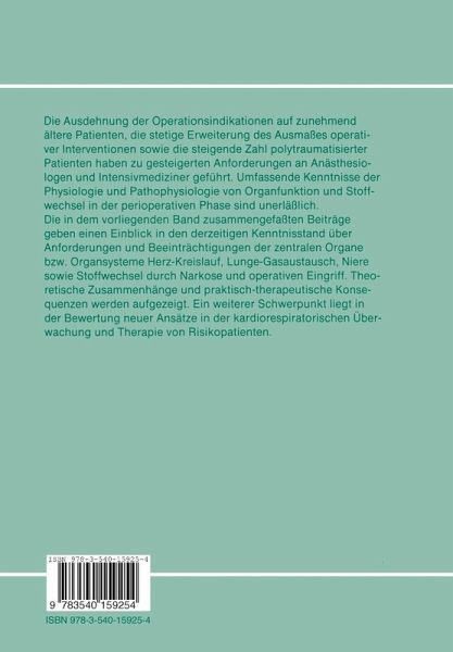 Die Ausdehnung der Operationsindikationen auf zunehmend al tere Patienten, die stetige Erweiterung des AusmaBes operativer Inter ventionen sowie die steigende Zahl polytraumatisierter Patienten haben zu gesteigerten Anforderungen an Anasthesiologen und In tensivmediziner geftihrt. Umfassende Kenntnisse der Physiologie und Pathophysiologie in der perioperativen Phase sind unerlaBlich geworden. Die Verfeinerung und Anpassung der Anasthesietechni ken, die Ausdehnung diagnostischer MaBnahmen und moderner Dberwachungsmethoden sowie die Ubernahme neuer Therapiekon zepte in der Intensivmedizin sind unbedingte Voraussetzung zur Risikominimierung als Folge der Entwicklung der operativen Medi zin der vergangenen Jahre. Die in dem vorliegenden Band zusammengefaBten Referate ge ben einen Einblick in den derzeitigen Kenntnisstand tiber Anfor derungen und Beeintrachtigungen zentraler Organe bzw. Organsy sterne: Herz/Kreislauf, Lunge/Gasaustausch, Niere sowie Stoff wechsel durch Narkose und operativen Eingriff. Theoretische Zu sammenhange wie auch praktisch-therapeutische Konsequenzen werden aufgezeigt. Ein weiterer Schwerpunkt liegt in der Bewer tung neuer Ansatze in der kardiorespiratorischen Dberwachung von Risikopatienten. Wir danken allen Referenten flir ihre informativen und aktuel len Beitrage und den beteiligten Firmen flir die groBztigige Unter sttitzung dieser Veranstaltung. Insbesondere danken wir dem Springer-Verlag, der es ermbglicht hat, in ktirzester Zeit diese Publikation herzustellen.