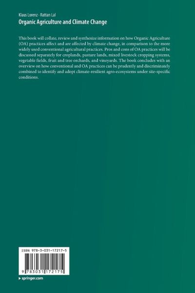 This book will collate, review and synthesize information on how Organic Agriculture (OA) practices affect and are affected by climate change, in comparison to the more widely used conventional agricultural practices. Pros and cons of OA practices will be discussed separately for croplands, pasture lands, mixed livestock cropping systems, vegetable fields, fruit and tree orchards, and vineyards. The book concludes with an overview on how conventional and OA practices can be prudently and discriminately combined to identify and adopt climate-resilient agro-ecosystems under site-specific conditions.