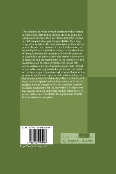 This volume addresses a broad spectrum of the environmental issues surrounding organic bromine and iodine compounds. It covers their partition among the environmental compartments and the potential for their long-range dissemination. The important issue of their atmospheric chemistry is discussed in detail in the context of ozone depletion and global warming, and the significant difference between the reactions of methyl bromide and methyl iodide are underscored. The mammalian toxicity is discussed and the mechanisms of the degradation and transformation of organic bromine and iodine compounds addressed. There has been considerable interest in naturally occurring metabolites in the current debate on the fate and partition of methyl bromide that is an important fungicide and is produced in substantial quantities as a metabolite of marine algae. The possible natural occurrence of diphenyl ethers that are used as flame retardants have also been raised. A discussion is given on plausible mechanisms for the biosynthesis of representative organic bromine and organic iodine metabolites. Reaction pathways are illustrated throughout and comprehensive references are given.