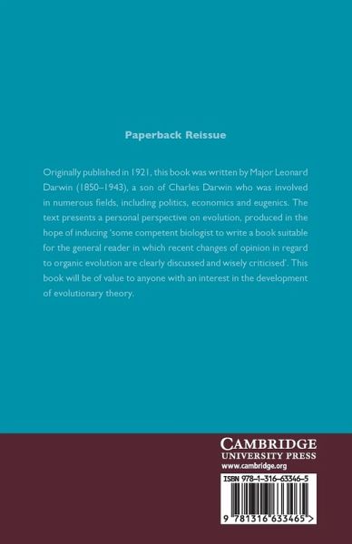 Originally published in 1921, this book by Major Leonard Darwin (1850â 1943), a son of Charles Darwin, presents a personal perspective on evolution, produced in the hope of inducing 'some competent biologist to write a book suitable for the general reader in which recent changes of opinion in regard to organic evolution are clearly discussed and wisely criticised'.