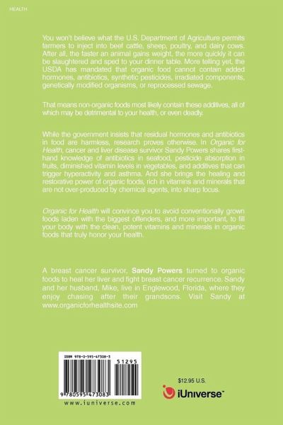 You won't believe what the U.S. Department of Agriculture permits farmers to inject into beef cattle, sheep, poultry, and dairy cows. After all, the faster an animal gains weight, the more quickly it can be slaughtered and sped to your dinner table. More telling yet, the USDA has mandated that organic food cannot contain added hormones, antibiotics, synthetic pesticides, irradiated components, genetically modified organisms, or reprocessed sewage. That means non-organic foods most likely contain these additives, all of which may be detrimental to your health, or even deadly. While the government insists that residual hormones and antibiotics in food are harmless, research proves otherwise. In Organic for Health, cancer and liver disease survivor Sandy Powers shares firsthand knowledge of antibiotics in seafood, pesticide absorption in fruits, diminished vitamin levels in vegetables, and additives that can trigger hyperactivity and asthma. And she brings the healing and restorative power of organic foods, rich in vitamins and minerals that are not over-produced by chemical agents, into sharp focus. Organic for Health will convince you to avoid conventionally grown foods laden with the biggest offenders, and more important, to fill your body with the clean, potent vitamins and minerals in organic foods that truly honor your health.