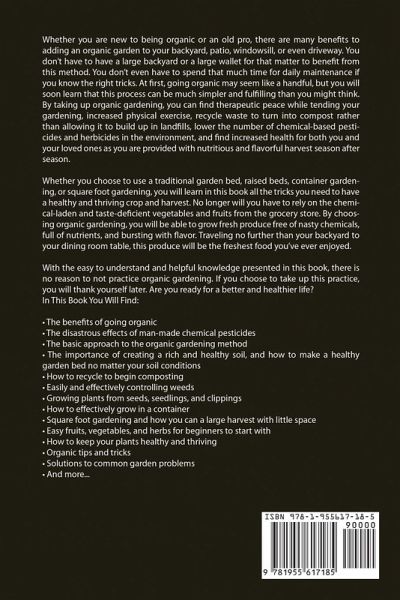 Whether you're new to being organic or an old pro, there are many benefits to adding an organic garden to your backyard, patio, windowsill, or even driveway. You don't have to have a large backyard or a large wallet for that matter to benefit from this method. You don't even have to spend that much time for daily maintenance if you know the right tricks. At first, going organic may seem like a handful, but you'll soon learn that this process can be much simpler and fulfilling than you might think. By taking up Organic Gardening, you can find therapeutic peace while tending your gardening, increased physical exercise, recycle waste to turn into compost rather than allowing it to build up in landfills, lower the number of chemical-based pesticides and herbicides in the environment, and find increased health for both you and your loved ones as you're provided with nutritious and flavorful harvest season after season... Whether you choose to use a traditional garden bed, raised beds, container gardening, or square foot gardening, with this book you'll learn all the tricks you need to have a healthy and thriving crop and harvest. No longer will you have to rely on the chemical-laden and taste-deficient vegetables and fruits from the grocery store. By choosing Organic Gardening, you'll be able to grow fresh produce free of nasty chemicals, full of nutrients, and bursting with flavor. Traveling no further than your backyard to your dining room table, this produce will be the freshest food you've ever enjoyed... With the easy to understand and helpful knowledge presented in this book, there's no reason to not practice organic gardening. If you choose to take up this practice, you'll thank yourself later. Are you ready for a better and healthier life? In This Book You'll Learn: The benefits of going organic The disastrous effects of man-made chemical pesticides The basic approach to the organic gardening method The importance of creating a rich and healthy soil, and how to make a healthy garden bed no matter your soil conditions How to recycle to begin composting Easily and effectively controlling weeds Growing plants from seeds, seedlings, and clippings How to effectively grow in a container Square foot gardening and how you can grow a large harvest with little space Easy fruits, vegetables, and herbs for beginners to start with How to keep your plants healthy and thriving Organic tips and tricks Solutions to common garden problems And so much more! Grab your copy of Organic Gardening For Beginners now!