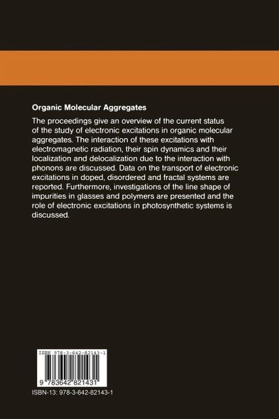 I Basic Concepts, Methods and Results.- Excited State Interaction and Energy Transfer Between Molecules in Organic Crystals - Basic Experimental Methods and Results.- Electronic Excitations in Molecular Solids.- II Interaction of Electronic Excitations with Electromagnetic Radiation.- Excitation Spectroscopy of Triplet State Monomers, Aggregates and Excitons in Anthracene Crystals.- Photoemission from Molecular Crystals, Bandstructure and Resonance Effects.- New Type of Local Resonances in Thin Rough Films.- III Electronic Excitations and Spin Dynamics.- Electron Spin Echo Spectroscopy of One-Dimensional Excitons.- Energy Transfer in Molecular Crystals and Its Influence on Spin Resonance.- Ensemble Averaged Spin Pair Dynamics of Doublet and Triplet Molecules.- IV Interaction of Electronic Excitations with Lattice Vibrations.- Localization and Delocalization of an Exciton in the Phonon Field.- Vibronic Excitons in the Intermediate Coupling Regime.- Photo-Induced Electron or Excitation Transfer Enhanced During Vibrational Relaxation and Generalized Förster's Formula.- Molecular Aggregates in Liquids Resolved by a Novel Raman Spectroscopy.- V Excimers, Charge Transfer Excitons and Exciton Fission.- Charge Transfer Spectra of Aromatic Hydrocarbon Crystals.- Exciton Band Structure and Excimer Formation.- Fission and Radiation!ess Transitions in Organic Molecular Crystals in Highly Excited States.- VI Electronic Excitations in Disordered Systems.- Transport and Thermodynamics of Physical Systems with Fractal Geometry.- Hopping Transport in Disordered Systems.- Energy Transfer and Relaxation Processes as Studied by Picosecond Fluorescence Spectroscopy.- Theoretical Methods for the Analysis of Exciton Capture and Annihilation.- Excitation Transport in NaphthaleneAggregates: Mixed Crystals, Amorphous Thin Films and Polymeric Glasses.- VII Electronic Excitation of Impurities in Glasses and Polymers.- Dynamical Linewidth Effects of Hole Burning of Free Base Phthalocyanine in Polymers: Spectral Diffusion and Exchange Narrowing.- Theory of Dephasing of Impurities in Glasses.- VIII Conductivity and Superconductivity in Organic Materials.- Spin Resonance and Conductivity of F1uoranthenyl Radical Cation Salts.- Conducting Polymers Derived from Pyrrole.- Organic Superconductors: Quasi One-Dimensional Conductors, Anomalous Superconductors.- IX Electronic Excitations in Photosynthetic Systems.- Optical Investigations of Photosynthetic Systems.- Index of Contributors.
