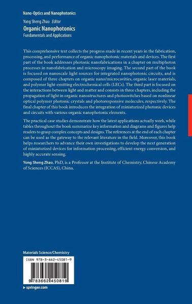 This comprehensive text collects the progress made in recent years in the fabrication, processing, and performance of organic nanophotonic materials and devices. The first part of the book addresses photonic nanofabrications in a chapter on multiphoton processes in nanofabrication and microscopy imaging. The second part of the book is focused on nanoscale light sources for integrated nanophotonic circuits, and is composed of three chapters on organic nano/microcavities, organic laser materials, and polymer light-emitting electrochemical cells (LECs). The third part is focused on the interactions between light and matter and consists in three chapters, including the propagation of light in organic nanostructures and photoswitches based on nonlinear optical polymer photonic crystals and photoresponsive molecules, respectively. The final chapter of this book introduces the integration of miniaturized photonic devices and circuits with various organic nanophotonic elements. The practical case studies demonstrate how the latest applications actually work, while tables throughout the book summarize key information and diagrams and figures help readers to grasp complex concepts and designs. The references at the end of each chapter can be used as the gateway to the relevant literature in the field. Moreover, this book helps researchers to advance their own investigations to develop the next generation of miniaturized devices for information processing, efficient energy conversion, and highly accurate sensing.