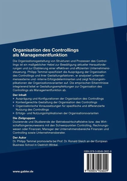 Die Organisationsgestaltung von Strukturen und Prozessen des Controllings ist ein maßgeblicher Hebel zur Bewältigung aktueller Herausforderungen und zur Etablierung einer effektiven und effizienten Unternehmenssteuerung. Philipp Temmel spezifiziert die Ausprägung der Organisation des Controllings und ihrer Gestaltungsfaktoren, er analysiert unternehmensexterne und -interne Erfolgsdeterminanten und zeigt Nutzungsimplikationen der Organisationsvarianten auf. Die empirischen Erkenntnisse integrierend leitet er Gestaltungsempfehlungen zur Organisation des Controllings als Managementfunktion ab.