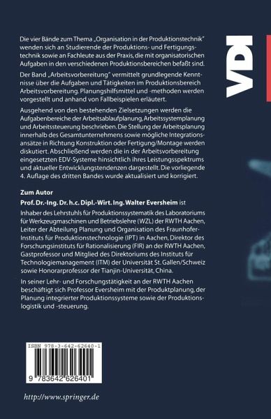 Dieses Buch enthält eine umfassende Darstellung der Aufgaben der Arbeitsvorbereitung, der anzuwendenden Methoden und Hilfsmittel. Ablaufplanung, Systemplanung und Steuerung, deren prozessorientierte Integration und die notwendige EDV-Unterstützung werden beschrieben. Das Buch richtet sich an Ingenieure und Studenten des Maschinenbaus, insbesondere an Praktiker aus dem Bereich der Arbeitsvorbereitung. Die Schwerpunkte der Darstellung bilden neben der Vermittlung des erforderlichen Grundwissens die für den Praktiker interessanten Planungshilfsmittel und Planungsmethoden, die anwendungsorientiert und detailliert beschrieben werden. In der Neuauflage dieses erfolgreichen Fachbuchs wurden zahlreiche Verbesserungen und Aktualisierungen vorgenommen.