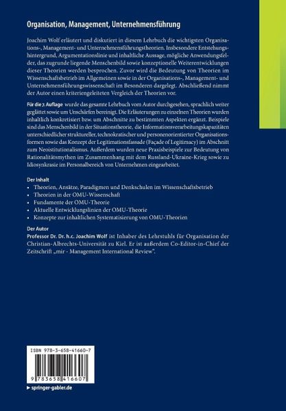 Joachim Wolf erläutert und diskutiert in diesem Lehrbuch die wichtigsten Organisations-, Management- und Unternehmensführungstheorien. Insbesondere Entstehungshintergrund, Argumentationsform und inhaltliche Aussage, mögliche Anwendungsfelder, das zugrunde liegende Menschenbild sowie konzeptionelle Weiterentwicklungen dieser Theorien werden besprochen. Zuvor wird die Bedeutung von Theorien im Wissenschaftsbetrieb im Allgemeinen sowie in der Organisations-, Management- und Unternehmensführungswissenschaft im Besonderen dargelegt. Abschließend nimmt der Autor einen kriteriengeleiteten Vergleich der Theorien vor.