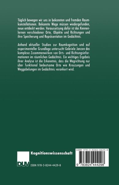 Anhand aktueller Studien zur Raumkognition und auf experimenteller Grundlage untersucht Gabriele Janzen das komplexe Zusammenwirken von Orts- und Richtungsinformationen im räumlichen Gedächtnis. Ein wichtiges Ergebnis ihrer Analyse ist die Erkenntnis, dass die Wegrichtung nur über funktional bedeutsame Orte wie Kreuzungen und Weggabelungen im Gedächtnis verankert wird.
