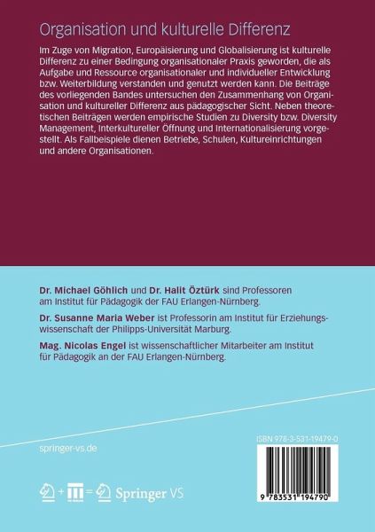 Zum Verhältnis von Organisation(en) und kultureller Differenz: Interventionen gegen Diskriminierung und Ungleichheit als Aufgabe pädagogischer Organisationen.- Organisation, Habitus und kulturelle Differenz.- Die Übersetzung der Organisation. Diversität in Organisationen: Managing Diversity als Herausforderung für Weiterbildungsorganisationen. - Diversity Management an Grundschulen.- Inter-Organisations-Kulturalität als Herausforderung in kooperativen Kontexten. Interkulturelle Öffnung: Lehrkräfte mit Migrationshintergrund als Motor für interkulturelle Schulentwicklung? Ergebnisse einer qualitativen Studie.- Internationalisierung von Organisationen: Organisation interkultureller Kommunikation und interkulturelle Kommunikation in Organisationen.