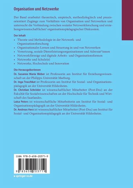 Der Band erarbeitet theoretisch, empirisch, method(olog)isch und praxisorientiert Zugänge zum Verhältnis von Organisation und Netzwerken und untersucht die Verbindung zwischen sozialer Netzwerkforschung und erziehungswissenschaftlicher/ organisationspädagogischer Diskussion.