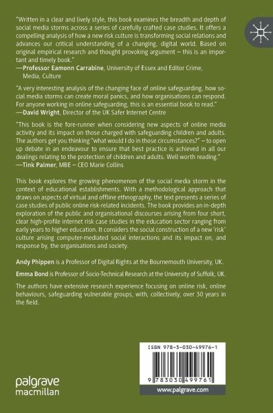 This book explores the growing phenomenon of the social media storm in the context of educational establishments. With a methodological approach that draws on aspects of virtual and offline ethnography, the text presents a series of case studies of public online risk-related incidents. Our ethnographic methodology adopts the use of unobtrusive data collection approaches, to explore publicly available data from online interactive behaviours. Drawing on a range of methods from internet mediated research (IMR) to inform our ethnographic account, the book provides an in-depth exploration of the public and organisational discourses arising from four short, clear high-profile internet risk case studies in the education sector ranging from early year to higher education. It considers the social construction of a new 'risk' culture arising computer-mediated social interactions and its impact on, and response by, the organisations and society.