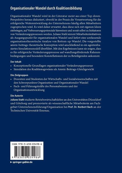 Organisationaler Wandel wird in der Literatur meist aus einer Top-down-Perspektive heraus diskutiert, obwohl in der Unternehmenspraxis die Verantwortung für die erfolgreiche Weiterentwicklung des Unternehmens in einer sich ständig verändernden Umwelt häufig allen Mitarbeiternzugesprochen und daher erwartet wird, dass sie sich mit eigenen Ideeneinbringen, auf Fehler und Verbesserungspotenziale hinweisen und somit selbst zu Initiatoren von Veränderungsprozessen werden. Juliane Stahlgreift Mitarbeiterinitiativen als Ausgangspunkt für organisationalen Wandel auf und liefert eine umfassende und tiefgreifende organisationstheoretische Analyse von Bottom-up-Wandel. Zur Erklärung, wie mitarbeiterinduzierte Veränderungsprozesse erfolgreich durchgesetzt werden können, werden die Koalitions- bzw. Anreiz-Beitrags-Theorie herangezogen, wonach hierfür notwendige Unterstützungsleistungen von den zu Beteiligenden nur dann erbrachtwerden, wenn sie von der Vorteilhaftigkeit überzeugt sind. Die vorgestellte anreiz-beitrags-theoretische Konzeption wird anschließend in ein agentenbasiertes Simulationsmodell überführt und ihre Schlüssigkeit belegt. Die Ergebnisse zeigen, dass es für erfolgreiche Veränderungsprozesse auf wandlungsfördernde Rahmenbedingungen und besondere Konstellationen der zu Beteiligenden ankommt, undlassen sich somit in konkrete Gestaltungsempfehlungen umsetzen.