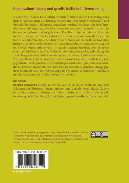 Dieses Open-Access-Buch bricht mit dem Konsens in der Forschung, nach dem Organisationen als Errungenschaft der modernen Gesellschaft und Produkt der Industrialisierung angesehen werden. Die Frage, wie sich Organisationen als eigenlogische Sozialform konkret ausdifferenziert haben, ist bislang weitgehend unklar geblieben. Das Buch zeigt auf, dass sich bereits in der "unorganisierten Gesellschaft" der Vormoderne formale Organisationen ausbildeten, die eine Struktur aufweisen, wie sie heute in Krankenhäusern, Landesrundfunkanstalten, Gerichten, Schulen und Kirchen prägend ist. Dieser Organisationstypus ist dadurch gekennzeichnet, dass er neben einer "politischen Spitze" und der damit verbundenen Rechtsbindung aus zwei übergreifenden Einheiten mit unterschiedlichen Rationalitäten besteht: Der eigentliche Kern der (medizinischen, journalistischen, rechtlichen, pädagogischen, theologischen, usw.) Leistungen wird durch professionelle Standards, Entscheidungsverfahren und Rituale zusammengehalten. Demgegenüber kümmert sich der Verwaltungsteil bei einem spezifischen Publikum um die Abnahme der im Kern erbrachten Arbeit.