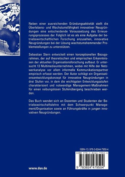 Sebastian Stern entwickelt einen konzeptionellen Bezugsrahmen, der auf theoretischen und empirischen Erkenntnissen der aktuellen Organisationsforschung aufbaut. Er untersucht 13 Multimediaunternehmen, wobei mit Hilfe der Netzwerkanalyse vor allem informelle Kommunikationspartner empirisch erfasst werden. Der Autor schlägt ein Organisationsentwicklungskonzept für innovative Neugründungen in drei Stufen vor, in dem die wichtigsten Entwicklungsstufen charakterisiert und notwendige Management-Maßnahmen für einen reibungslosen Stufenübergang beschrieben werden.