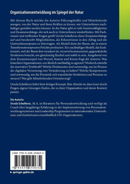 Mit diesem Buch möchte die Autorin Führungskräfte und Mitarbeitende anregen, von der Natur und ihren Kräften zu lernen, wie Unternehmen nachhaltiger gestaltet werden können. In der Natur gibt es viele Gesetzmäßigkeiten und Zusammenhänge, die sich auch in Unternehmen wiederfinden. Mit Fachwissen und treffenden Fragen greift Ursula Schullerus diese Zusammenhänge auf und beschreibt Möglichkeiten, die Erkenntnisse in den Alltag und die Unternehmenspraxis zu übertragen. Als Modell dient der Baum, der in einem Transformationsprozess Früchte produziert. Ein nachhaltiges Modell, das funktioniert, weil der Baum fest verankert ist, vernetzt kommuniziert, gegensätzliche Strukturen braucht, um gleichzeitig flexibel und stabil zu sein. Ausgehend von dem Zusammenspiel von Wurzel, Stamm und Krone fragt die Autorin: Was brauchen Organisationen, um ähnlich nachhaltig zu agieren? Wodurch entsteht die innovative Triebkraft? Welche Denkmuster sind notwendig, um im Prozess der digitalen Vernetzung eine Verankerung zu halten? Welche Kompetenzen sind notwendig, um die Dynamik sich wandelnder Strukturen und Prozesse zu steuern? Was gibt Mitarbeitenden Orientierung?