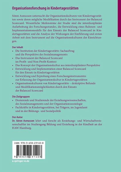 Sören Asmussen untersucht die Organisationskulturen von Kindertagesstätten sowie deren mögliche Modifikation durch das Instrument der Balanced Scorecard. Wesentliche Meilensteine der Studie sind die interdisziplinäre Aufarbeitung des Forschungsstandes, die Entwicklung eines Rahmen- und Implementationsmodells für den Einsatz der Balanced Scorecard in Kindertagesstätten und die Analyse der Wirkungen der Einführung und ersten Arbeit mit dem Instrument auf die Organisationskulturen der Einrichtungen.