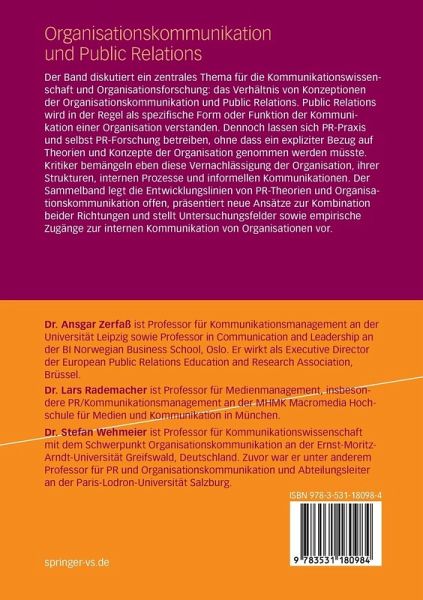 Der Band diskutiert ein zentrales Thema für die Kommunikationswissenschaft und Organisationsforschung: Das Verhältnis von Konzeptionen der Organisationskommunikation und Public Relations. Die Autoren legen die Entwicklungslinien von PR-Theorien und Organisationskommunikation offen, präsentieren neue Ansätze zur Kombination beider Richtungen und stellen neue Untersuchungsfelder sowie empirische Zugänge zur internen Kommunikation von Organisationen vor.