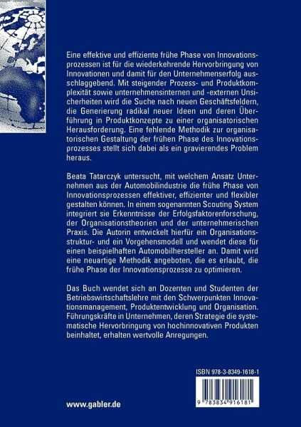 Beata Tatarczyk untersucht, mit welchem Ansatz Unternehmen aus der Automobilindustrie die frühe Phase von Innovationsprozessen effektiver, effizienter und flexibler gestalten können. In einem sogenannten Scouting System integriert sie Erkenntnisse der Erfolgsfaktorenforschung, der Organisationstheorien und der unternehmerischen Praxis. Die Autorin entwickelt hierfür ein Organisationsstruktur- und ein Vorgehensmodell und wendet diese für einen beispielhaften Automobilhersteller an. Damit wird eine neuartige Methodik angeboten, die es erlaubt, die frühe Phase der Innovationsprozesse zu optimieren.