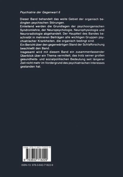 Dieser Band behandelt das weite Gebiet der organisch bedingten psychischen Störungen. Einleitend werden die Grundlagen der psychoorganischen Syndromlehre, der Neuropsychologie, Neurophysiologie und Neuroradiologie abgehandelt. Der Hauptteil des Bandes beschreibt in mehreren Beiträgen alle wichtigen Gruppen psychiatrischer Krankheiten, die organisch bedingt sind. Ein Bericht über den gegenwärtigen Stand der Schlafforschung beschließt den Band. Insgesamt wird mit diesem Band ein zusammenfassender Überblick über ein Thema vermittelt, das trotz seiner großen epidemiologischen Bedeutung seit längerer Zeit nicht mehr im Vordergrund des psychiatrischen Interesses gestanden hat.