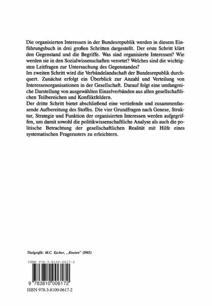 I: Grundlagen.- 1 Einstieg in das Thema.- 2 Was sind "organisierte Interessen"?.- 3 Organisierte Interessen und Interessenvermittlung.- 4 Zusammenfassung.- II: Erscheinungsbild.- 1 Die Bundesrepublik als organisierte Gesellschaft.- 2 Die Darstellung organisierter Interessen.- 3 Fallbeispiele zum Erscheinungsbild organisierter Interessen in der Bundesrepublik.- III: Grundfragen.- 1 Genese.- 2 Struktur.- 3 Strategie.- 4 Funktion.