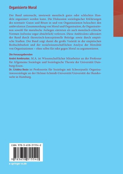 Organisation und Moral. Einleitung zu einem ungeklärten, aber spannungsreichem Verhältnis.- Mein Freund Harvey. Warum Organisationen keine moralischen Akteure sind, mit Organisationen aber moralisch gehandelt wird.- Das Gespenst des korporativen Akteurs. Antwort auf Thomas Klatetzki.- Erwiderung auf Günther Ortmanns kritische Einwände.- Moral als integraler Bestandteil organisierter Handlungssysteme: Eine Parsons'sche Perspektive.- Heuchelei statt Konflikt. Eine systemtheoretische Analyse organisierter Moral ".- Nicht ganz passend? Moral und Organisation im Neo-Institutionalismus.- Organisationen als Instanzen der Moralisierung sozialer Praxis. Zur Verflechtung reflexiv-moderner Wertkomplexe in Transformationsfeldern.- Moral in organisierten Feldern. Grundzüge zu einer feldtheoretischen Organisationssoziologie.- Compliance und Integrität. Windows-Dressing oder rationale Unternehmensstrategie?.- Dynamiken der Meta-Formalisierung von Moral. Organisationale Entdifferenzierung und Personalisierung im Kontext organisationalen Compliance Managements.- The Translation of Organizational Morals in Discourses.- Organisierte Vernunft. Zur Soziologie deliberativer Verfahren.- Moralische Entscheidungsdilemmata im Militär. Die Marine zwischen Seenotrettung und Grenzschutzauftrag.- Moral total? Wohnungslosenzeitungen als prekäre Hybridprojekte.- Foodbanks: Moralisierte Organisation zwischen Vermittlung und Verteilung.- Olympische Spiele: Das IOC in der Falle. Diskussion eines Lösungsansatzes.- Entschieden achtungswürdig. Die organisierte Feststellung des "heroischen Tugendgrades"