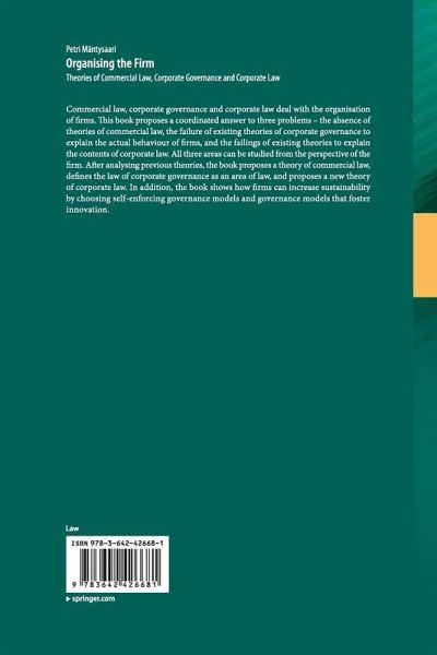 The theoretical basis of commercial law, corporate governance law, and corporate law is still unsatisfactory. There essentially is no theory of commercial law, and existing theories of corporate governance and corporate law cannot explain the behaviour of firms or the contents of existing regulation. This book proposes a coordinated solution for all three areas. The starting point is that all three areas deal with the organisation of firms. Commercial law, corporate governance, and corporate law are therefore studied from the perspective of the firm rather than that of the judge or the investor. Changing the perspective makes it easier to formulate an "umbrella" theory of commercial law, and theories of corporate governance and corporate law as applications of the main theory. The book provides examples of how the proposed theories work by studying legal corporate governance tools and practices that increase the sustainability of the firm. Sustainability can be bolstered by making the governance model more self-enforcing and ensuring that it fosters innovation.