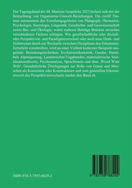 Der Tagungsband der 48. Matreier Gespräche 2023 befasst sich mit der Betrachtung von Organismus-Umwelt-Beziehungen. Die zwölf Themen entstammen den Forschungsgebieten von Pädagogik, Ökonomie, Psychologie, Soziologie, Linguistik, Geschichts- und Geowissenschaft sowie Bio- und Ökologie, wobei mehrere Beiträge Brücken zwischen verschiedenen Fächern schlagen. Wie gesellschaftliche oder disziplinäre Perspektiven- und Paradigmenwechsel oder auch neue Denk- und Sichtweisen durch ein Wechseln zwischen Disziplinen den Erkenntnisfortschritt vorantreiben, wird an einer Vielheit konkreter Beispiele ausgelotet: Bestattungstechniken, Evolutionsökonomik, Gender, Hannibals Alpenquerung, Landstreicher/Vagabunden, materialistische Sozialisationstheorie, Psychoanalyse, Sprachinseln und dem "Wood Wide Web". Grundsätzliche Überlegungen zur Rolle von Genen und Menschen als Konstrukte oder Konstrukteure und zum generellen Erkenntniswert des Perspektivenwechsels runden den Band ab.