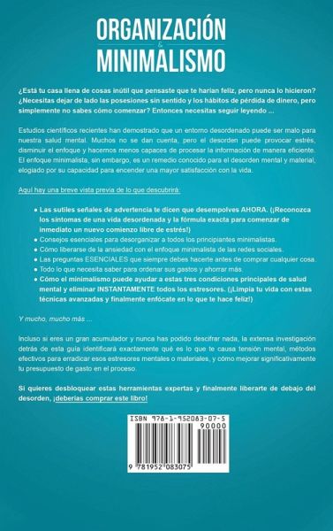 ¿Está tu casa llena de cosas inútil que pensaste que te harían feliz, pero nunca lo hicieron? ¿Necesitas dejar de lado las posesiones sin sentido y los hábitos de pérdida de dinero, pero simplemente no sabes cómo comenzar? Entonces necesitas seguir leyendo ... Estudios científicos recientes han demostrado que un entorno desordenado puede ser malo para nuestra salud mental. Muchos no se dan cuenta, pero el desorden puede provocar estrés, disminuir el enfoque y hacernos menos capaces de procesar la información de manera eficiente. El enfoque minimalista, sin embargo, es un remedio conocido para el desorden mental y material, elogiado por su capacidad para encender una mayor satisfacción con la vida. Aquí hay una breve vista previa de lo que descubrirá: Las sutiles señales de advertencia te dicen que desempolves AHORA. (¡Reconozca los síntomas de una vida desordenada y la fórmula exacta para comenzar de inmediato un nuevo comienzo libre de estrés!) Consejos esenciales para desorganizar a todos los principiantes minimalistas. Cómo liberarse de la ansiedad con el enfoque minimalista de las redes sociales. Las preguntas ESENCIALES que siempre debes hacerte antes de comprar cualquier cosa. Todo lo que necesita saber para ordenar sus gastos y ahorrar más. Cómo el minimalismo puede ayudar a estas tres condiciones principales de salud mental y eliminar INSTANTAMENTE todos los estresores. (¡Limpia tu vida con estas técnicas avanzadas y finalmente enfócate en lo que te hace feliz!) Y mucho, mucho más ... Incluso si eres un gran acumulador y nunca has podido descifrar nada, la extensa investigación detrás de esta guía identificará exactamente qué es lo que te causa tensión mental, métodos efectivos para erradicar esos estresores mentales o materiales, y cómo mejorar significativamente tu presupuesto de gasto en el proceso. Si quieres desbloquear estas herramientas expertas y finalmente liberarte de debajo del desorden, ¡deberías comprar este libro!