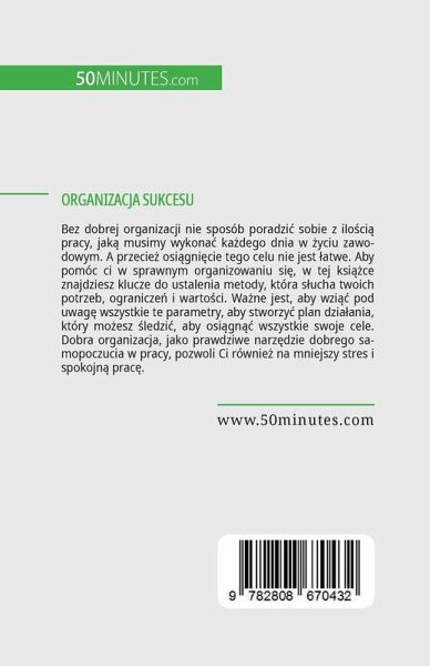 Bez dobrej organizacji nie sposób poradzi¿ sobie z ilo¿ci¿ pracy, jak¿ musimy wykonä kädego dnia w ¿yciu zawodowym. A przecie¿ osi¿gni¿cie tego celu nie jest ¿atwe. Aby pomóc ci w sprawnym organizowaniu si¿, w tej ksi¿¿ce znajdziesz klucze do ustalenia metody, która s¿ucha twoich potrzeb, ogranicze¿ i warto¿ci. Wäne jest, aby wzi¿¿ pod uwag¿ wszystkie te parametry, aby stworzy¿ plan dziäania, który mo¿esz ¿ledzi¿, aby osi¿gn¿¿ wszystkie swoje cele. Dobra organizacja, jako prawdziwe narz¿dzie dobrego samopoczucia w pracy, pozwoli Ci równie¿ na mniejszy stres i spokojn¿ prac¿.