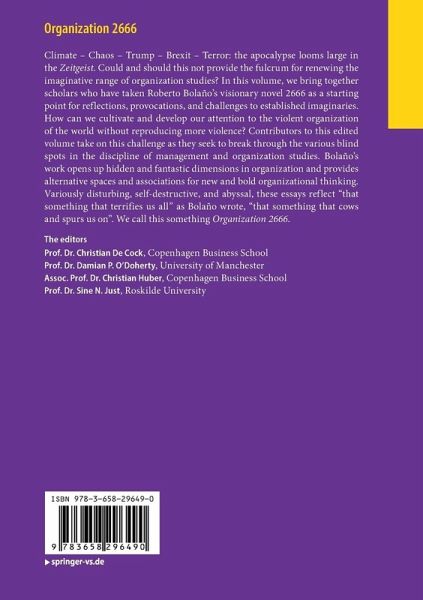 Climate - Chaos - Trump - Brexit - Terror: the apocalypse looms large in the Zeitgeist. Could and should this not provide the fulcrum for renewing the imaginative range of organization studies? In this volume, we bring together scholars who have taken Roberto Bolaño's visionary novel 2666 as a starting point for reflections, provocations, and challenges to established imaginaries. How can we cultivate and develop our attention to the violent organization of the world without reproducing more violence? Contributors to this edited volume take on this challenge as they seek to break through the various blind spots in the discipline of management and organization studies. Bolaño's work opens up hidden and fantastic dimensions in organization and provides alternative spaces and associations for new and bold organizational thinking. Variously disturbing, self-destructive, and abyssal, these essays reflect "that something that terrifies us all" as Bolaño wrote, "that something that cowsand spurs us on". We call this something Organization 2666.