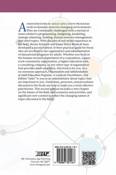 Administrators of adult education programs work in dynamic and ever-changing environments. They are continually challenged with a myriad of issues related to programming, budgeting, marketing, strategic planning, funding, human resource management, and other topics. With decades of real-world experience in the field, Steven Schmidt and Susan Yelich Biniecki have developed a second edition of their practical guide for those who are involved in the organization and administration of educational programs for adults. Whether you work in the human resource department of a corporation, a grass-roots community organization, a higher education unit, a consulting company, or any other type of organization that provides adult education, this book is for you. In a no-nonsense approach, Organization and Administration of Adult Education Programs: A Guide for Practitioners, 2nd Edition "talks" to you as an administrator about topics that are important to you. Guidelines, processes, and procedures discussed in the book can help to make you a more effective practitioner. This second edition includes a new chapter on the future of the field, new scenarios and activities, and significant new content to reflect the changing nature of topics discussed in the book.