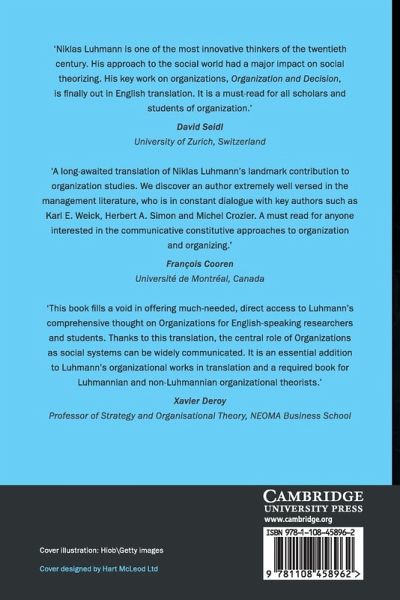Niklas Luhmann (1927-1998) ranks as one of the most important German social theorists of the twentieth century. His works have been highly influential in sociology and other social sciences, including organization studies. The significance of organizations for Luhmann can be traced in his biography: at the beginning of his career, he spent almost eight years as a legal expert in public administration, through which he gained professional expertise in the function of organizations. This practice inspired much of his later theoretical work at Harvard's Graduate School for Public Administration, the University for Public Administration at Speyer, the Center for Social Research in Dortmund, where he was head of department, and at the Department for Sociology at Bielefeld University, where he largely refrained from administrative work. This book, which was one of Luhmann's last, can be regarded as his conclusion to over thiry years of research on organized social systems.