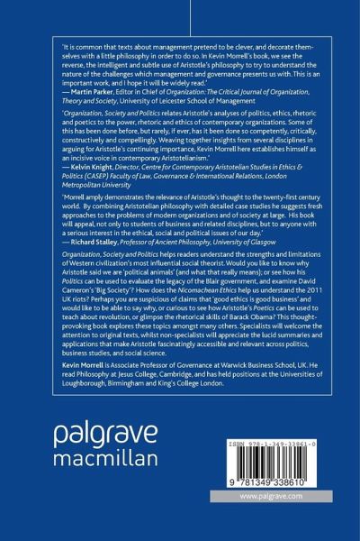 "It is common that texts about management pretend to be clever, and decorate themselves with a little philosophy in order to do so. In Kevin Morrell's book, we see the reverse, the intelligent and subtle use of Aristotle's philosophy to try to understand the nature of the challenges which management and governance presents us with. This is an important work, and I hope it will be widely read." - Martin Parker, Editor in Chief of Organization: The Critical Journal of Organization, Theory and Society, University of Leicester School of Management, UK "Organization, Society and Politics relates Aristotle's analysis of politics, ethics, rhetoric and poetics to the power, rhetoric and ethics of contemporary organization. Some of this has been done before, but rarely, if ever, has it been done so competently, critically, constructively and compellingly. Weaving together insights from several disciplines in arguing for Aristotle's continuing importance, Kevin Morrell here establishes himself as an incisive voice in contemporary Aristotelianism." - Kelvin Knight, Author of Aristotelian Philosophy: Ethics and Politics from Aristotle to MacIntyre, Director, Centre for Contemporary Aristotelian Studies in Ethics & Politics (CASEP) Faculty of Law, Governance & International Relations, London Metropolitan University, UK "Morrell amply demonstrates the relevance of Aristotle's thought to the twenty-first century world. By combining Aristotelian philosophy with detailed case studies he suggests fresh approaches to the problems of modern organizations and of society at large. His book will appeal, not only to students of business and related disciplines, but to anyone with a serious interest in the ethical, social and political issues of our day." - Richard Stalley, Professor of Ancient Philosophy, University of Glasgow, UK