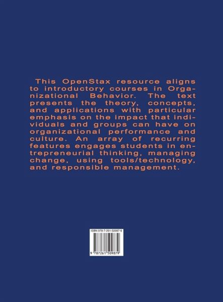 This OpenStax resource aligns to introductory courses in Organizational Behavior. The text presents the theory, concepts, and applications with particular emphasis on the impact that individuals and groups can have on organizational performance and culture. An array of recurring features engages students in entrepreneurial thinking, managing change, using tools/technology, and responsible management.