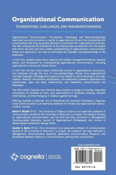 Organizational Communication: Foundations, Challenges, and Misunderstandings examines how communication is central to organizational life and the complexities and complications that arise as people attempt to coordinate their organizational activities. The text underscores the importance of the relationships we establish with the people with whom we work and how a better understanding of organizational communication theory and application can help us anticipate and manage misunderstandings in the workplace. In Part One, students learn about classical and modern management theories, systems theory, and frameworks for understanding organizational communication, including organizational culture and critical theory. In Part Two, the text covers topics traditionally covered in organizational communication textbooks through the lens of misunderstandings. Stories from organizational members highlight challenges and opportunities related to communicating in the organization. Realistic recruitment, socialization, the relationship between supervisors and subordinates, peer and team relationships, and leadership communication are addressed. The fifth edition features new interview data; broader coverage of diversity; expanded discussions of emotions at work; and examinations of workplace bullying, blended relationships, and technology as it relates to gender and age. Offering students a balanced mix of theoretical and practical information, Organizational Communication is an exemplary textbook for introductory organizational communication courses.