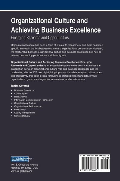 Organizational culture has been a topic of interest to researchers, and there has been specific interest in the link between culture and organizational performance. However, the relationship between organizational culture and business excellence and how to achieve outstanding performance is still ambiguous. Organizational Culture and Achieving Business Excellence: Emerging Research and Opportunities is an essential research reference that examines the association between organizational culture type and business excellence and the moderating effect of ICT use. Highlighting topics such as data analysis, culture types, and productivity, this book is ideal for business professionals, managers, private organizations, government agencies, researchers, and academicians.