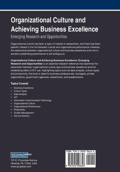 "This book explores the role of ICT utilization in the organizational culture and business excellence context. It also examines the influence of organizational culture on business excellence in general, then looking at the effect of each organizational culture type (mission, adaptability, involvement, consistency) on each business excellence area (customers, people, society, and business)"--