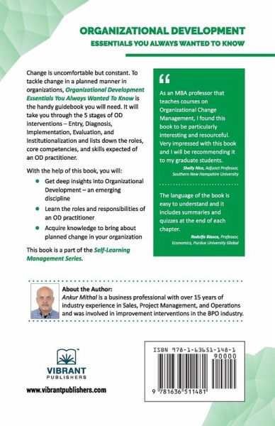 A Complete Guide to OD Interventions, Change Management, and Practitioner Skills. An insight into the evolving discipline of Organizational Development and the process of implementing an intervention under it.Do you want to know what role they play in the life of an organization? Would you like to know more about what an OD practitioner actually does for an organization? What exactly is an OD intervention through which change is introduced into an organization? Organizational Development Essentials You Always Wanted To Know answers these questions and many more. It is a ready reckoner for people who would like to know more about the subject but do not know where to start. It seeks to provide an understanding of the still relatively new and evolving discipline of OD along with its key characteristics, core values, and goals. In order that it is not confused with some other disciplines like Change Management and Human Resource Management, a distinction is also drawn between them. The book builds the theory of OD around the concept of constant change and suggests that organizations need to move from change that is thrust upon them to change that is planned, with the help of OD interventions. The book also discusses the 5 stages of OD interventions - Entry, Diagnosis, Implementation, Evaluation, and Institutionalization in detail. The discussion is rounded off by discussing the OD practitioner's core competencies, skills, ethical issues, and knowledge required as well as the expectations the organization has. The book is an ideal pick for managers and leaders in organizations who wish to acquaint themselves with all the aspects of OD. It will be a useful guidebook for students and help them explore the field of OD for a prospective career. This book is part of the Self-Learning Management Series designed to help students, managers, career switchers, and entrepreneurs learn essential management lessons