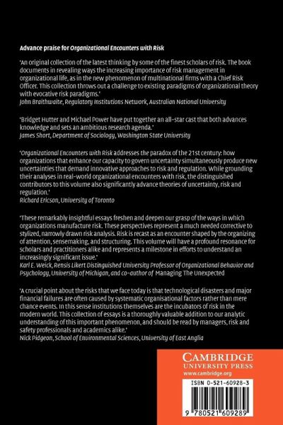 Acknowledgements 1. Organizational encounters with risk: an introduction Bridget Hutter and Michael Power 2. Organizational rituals of risk and error Diane Vaughan 3. 'Ways of seeing': understandings of risk in organisational settings Bridget Hutter 4. Risk and rules: the 'legalization' of medicine Carol A. Heimer, Juleigh Coleman Petty and Rebecca J. Culyba 5. Organizational responses to risk: the rise of the Chief Risk Officer Michael Power 6. Incentives, risk and accountability in organizations Timothy Besley and Maitreesh Ghatak 7. Mathematizing risk: models, arbitrage and crises Donald MacKenzie 8. Interdependencies within an organization Howard Kunreuther and Geoffrey Heal 9. Restoring reason: causal narratives and political culture Sheila Jasanoff Bibliography Index.