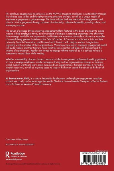 This employee engagement book focuses on the HOW of engaging employees in sustainability through four diverse case studies, thought-prompting questions and tips, as well as a unique model of employee engagement to guide strategy. The book includes both the mechanics of engagement and also the art of engagement through practices of authenticity, collective leadership, curating culture, and leveraging purpose. The power of purpose-driven employee engagement efforts featured in this book will inspire readers to help employees thrive, as a by-product of doing so is retaining employees, who effectively drive strategy, which lifts the organization and bolsters the economic bottom line. Numerous examples of successful engagement initiatives at Dubai Chamber of Commerce and Industry, Arizona State University, Seventh Generation, and Danone North America will catalyze readers' imaginations regarding what is possible at their organizations. Moran's purpose-driven employee engagement model will guide readers and their teams to hone initiatives into ones that will align with the heart and the systems of the organization. Prompting tips and questions throughout the text invite readers to engage with the material, so it is advised to have a notebook to record ideas while reading. Whether sustainability directors, human resource or talent management professionals seeking guidance on how to engage employees, middle managers striving to drive organizational change, or business school students wanting to learn about purpose-driven organizations, this book provides myriad tangible resources, as well as inspiring cases, to support the human capital that serves as the heart of organizations.