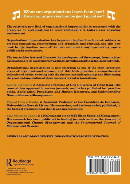 The relatively new field of organizational improvisation is concerned with the pressures on organizations to react continually to today's ever-changing environment. Organizational improvisation has important implications for such subjects as product innovation, teamworking and organizational renewal, and this new book brings together some of the best and most thought-provoking papers published in recent years. This area is now emerging as one of the most important in organizational science, and this book provides a comprehensive collection suitable for students, researchers and practitioners alike.
