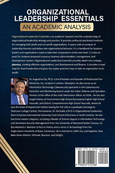 Organizational Leadership Essentials: An Academic Analysis by Dr. Augustine E. Eta, Ph.D., is a comprehensive and scholarly examination of leadership principles and strategies that drive success in both profit and nonprofit organizations. With a strong foundation in academic research and real-world experience, this book provides valuable insights into the complex and dynamic field of organizational leadership. The book explores a wide range of leadership theories, including stewardship, servant leadership, agency theory, strategic contingencies theory, and transformational leadership theory. These foundational concepts are essential for understanding the role of leaders in guiding organizations toward efficiency, growth, and sustainability. Additionally, the book examines the development of organizational behavior, offering insights into group dynamics, leadership effectiveness, employee motivation, and decision-making processes. A significant focus of this work is on team building and collaboration, providing strategies for selecting and leading high-functioning teams, managing conflicts, and fostering a culture of trust and innovation. The book also delves into board leadership and governance, highlighting the responsibilities of board members, executive directors, and organizational stakeholders in ensuring ethical and effective leadership. Dr. Eta further addresses strategic planning and execution, offering a detailed discussion on mission statements, SWOT analysis, stakeholder engagement, and the planning process. He emphasizes the importance of vision, organizational culture, and leadership succession in creating effective organizations. The book also provides practical guidance on financial management, fundraising, and institutional development, making it an invaluable resource for leaders looking to ensure long-term organizational success. Written for business executives, nonprofit leaders, students of leadership and management, and anyone passionate about organizational excellence, this book is both a theoretical guide and a practical handbook. It equips readers with proven leadership strategies that can be applied in various organizational settings, helping them navigate challenges, inspire teams, and drive meaningful change. Whether you are an aspiring leader, an experienced executive, or a student of business and organizational leadership, Organizational Leadership Essentials: An Academic Analysis will serve as an indispensable resource for mastering the art and science of leadership.
