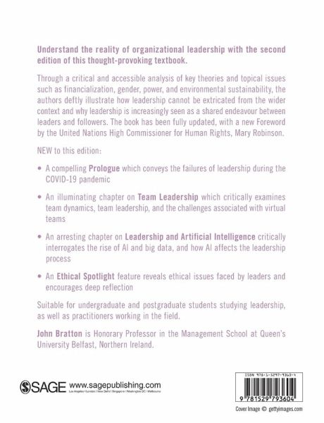 A new chapter on Team Leadership looks at team dynamics, the role of technology in teamworking and the challenges arising for virtual teams A new chapter on Leadership and Artificial Intelligence covers the rise of AI and big data, and how AI affects the employment relationship and leader-follower relations A new Ethical Spotlight feature in all chapters explores ethical issues faced by leaders and encourages reflection