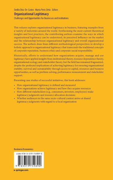 This volume explores organizational legitimacy in business, featuring examples from a variety of industries around the world. Synthesizing the most current theoretical insights and best practices, the contributing authors examine the ways in which organizational legitimacy can be understood, its perceived influence on the market, and the relationship between organizational legitimacy and overall organizational success. The authors draw from different methodological perspectives to develop a holistic approach to organizational legitimacy that transcends the traditional concepts of corporate reputation, business ethics or corporate social responsibility.