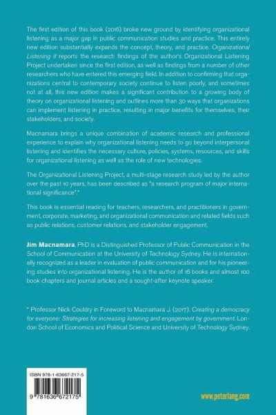 Macnamara brings a unique combination of academic research and professional experience to explain why organizational listening needs to go beyond interpersonal listening and identifies the necessary culture, policies, systems, resources, and skills for organizational listening as well as the role of new technologies. The Organizational Listening Project, a multi-stage research study led by the author over the past 10 years, has been described as "a research program of major international significance"._