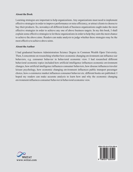 Learning strategies are important to help organizations. Any organizations must need to implement effective strategies in order to improve performance or raise efficiency,or attract clients to choose to buy their products. So, nowadays all different kinds of business organizations ought make the most effective strategies in order to achieve any one of above business targets. In my this book, I shall explain some effective strategies to let these organizations in order to help they earn the most chance to achieve the above aims. Readers can make analysis to judge whether these strategies may be the most effective to achieve above aims.