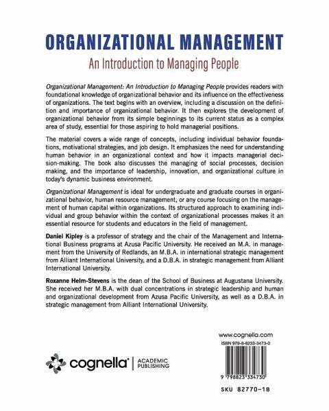 Organizational Management: An Introduction to Managing People provides readers with foundational knowledge of organizational behavior and its influence on the effectiveness of organizations. The text begins with an overview, including a discussion on the definition and importance of organizational behavior. It then explores the development of organizational behavior from its simple beginnings to its current status as a complex area of study, essential for those aspiring to hold managerial positions. The material covers a wide range of concepts, including individual behavior foundations, motivational strategies, and job design. It emphasizes the need for understanding human behavior in an organizational context and how it impacts managerial decision-making. The book also discusses the managing of social processes, decision making, and the importance of leadership, innovation, and organizational culture in today's dynamic business environment. Organizational Management is ideal for undergraduate and graduate courses in organizational behavior, human resource management, or any course focusing on the management of human capital within organizations. Its structured approach to examining individual and group behavior within the context of organizational processes makes it an essential resource for students and educators in the field of management.