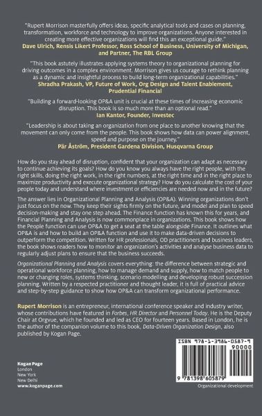 Section ONE: Introduction; Chapter 1.1: Organizational planning and analytics; Chapter 1.2: Data driven organization design; Chapter 1.3: Financial planning and analytics; Section TWO: Making it real Transformation and optimization; Chapter 2.1: Introduction; Chapter 2.2: Preparing to execute; Chapter 2.3: Implementation; Chapter 2.4: Ongoing optimization; Section THREE: Workforce Planning; Chapter 3.1: Introduction; Chapter 3.2: Supply forecasting and top down demand planning; Chapter 3.3: Bottom up position planning, finalizing the workforce plan and monitoring progress; Section FOUR: OP&A analysis; Chapter 4.1: Introduction; Chapter 4.2: Laying the foundations for effective OP&A analysis; Chapter 4.3: Ignoring statistical traps and leveraging data science; Section FIVE: The OP&A function; Chapter 5.1: Introduction; Chapter 5.2: Stage 1: Scoping the macro operating design and writing the business case; Chapter 5.3: Stage 2: Detailing the OP&A function; Chapter 5.4: Stage 3: Making the OP&A function real; Chapter 18: Glossary