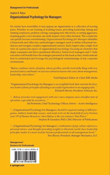 No matter how monolithic it may appear, an organization is a collection of moving parts. Whether we are looking at building teams, providing leadership, hiring and training employees, problem solving, managing time effectively, or setting aggressive, inspiring goals, every decision can easily impact every other decision. The complexity can quickly become overwhelming. Organizational Psychology identifies a framework and offers key methodologies managers need to define behavioral tendencies and navigate complex organizational systems. Each chapter takes a high-level view of a particular aspect of organizational psychology, focusing on elements that shape companies and drive operational efficiency. Senior-level managers and C-Suite executives will benefit from the strategies presented in this book as they clearly indicate how to understand and leverage the psychological underpinnings of any corporate environment.