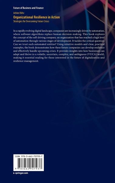 In a rapidly evolving digital landscape, companies are increasingly driven by automation, where software algorithms replace human decision-making. This book explores the concept of the self-driving company, an organization that has reached a high level of automation through various stages of development. It tackles the critical question: Can we trust such automated entities? Using intuitive models and clear, practical examples, the book demonstrates how these future companies can develop resilience and effectively handle upcoming crises. It provides insights into how businesses can adapt and thrive in a volatile, uncertain, complex, and ambiguous (VUCA) world, making it essential reading for those interested in the future of digitalization and resilience management.